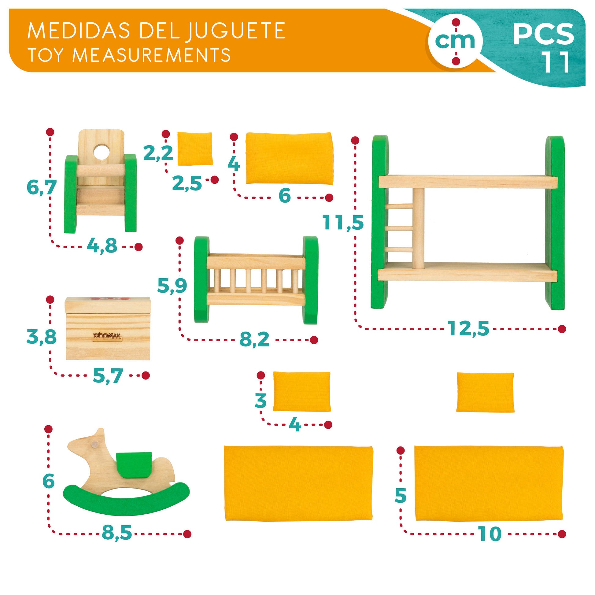 ¡Amuebla tu casita de muñecas con el mobiliario de madera WOOMAX! Este set de muebles decorará la habitación infantil ¡y la dejará preciosa! Incluye 12 piezas: 1 litera, 1 cuna, 1 trona, 1 caballito y 1 baúl. La cunita y las camas vienen acolchadas y los muebles son de color madera y verde. Juguete 100% reciclable, compatible con otros sets de mobiliario WOOMAX. A partir de 3 años.