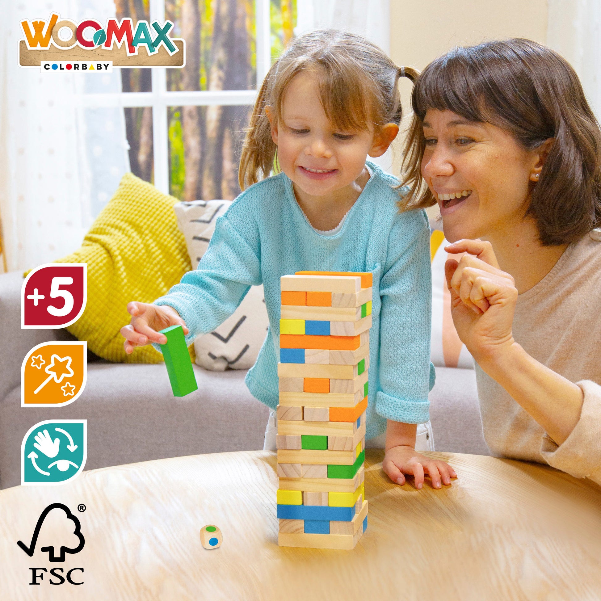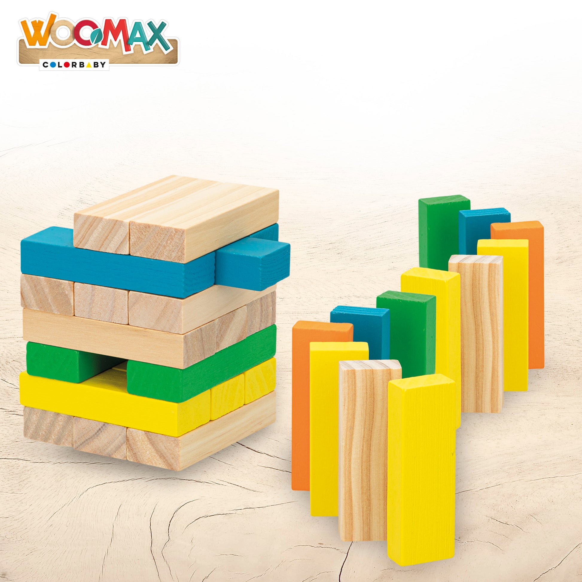 Torre de bloques en madera natural de WOOMAX. Incluye 57 piezas de madera de 7,5x2 y de 5x1,5 cm de diferentes colores: 6 amarillas, 6 azules, 6 verdes y 6 naranjas, 33 en color madera y 1 dado. Los juegos de bloques fomentan la imaginación y favorecen la coordinación entre manos-ojos. Edad recomendada para mayores de 5 años. ¡Se lo pasarán en grande con WOOMAX! Es un juguete adscrito a la iniciativa "Comparte y recicla", una acción solidaria de la Fundación Crecer Jugando cuyo objetivo es la recogida de juguetes para su donación a organizaciones benéficas españolas.