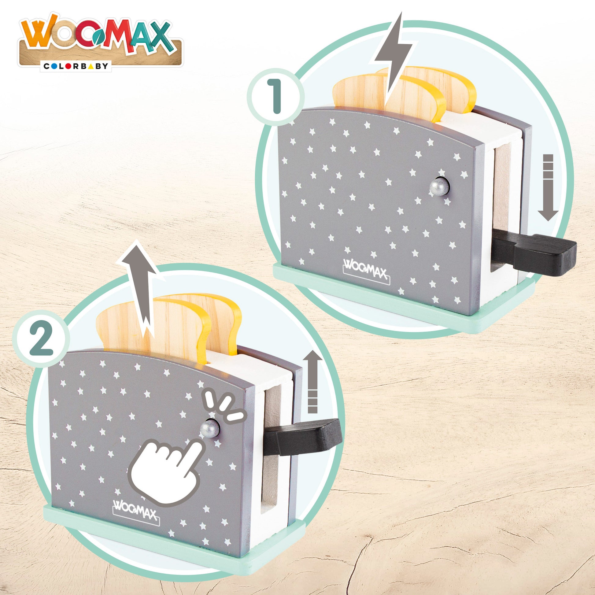 Prepara ricas tostadas con la tostadora de madera WOOMAX, material natural 100% ecológico y reciclable. Incluye 4 rebanadas de pan, mantequilla,1 plato y 1 cuchillo. Mete el pan y baja la palanca. Pulsa el botón y ¡las tostadas saltarán! Diseño redondo muy cuidado con dulces colores pastel en gris y azul celeste con estampado de estrellitas. Juguete educativo que desarrolla la imaginación y coordinación ojo-mano. A partir de 24 meses. Es un juguete adscrito a la iniciativa "Comparte y recicla", una acción solidaria de la Fundación Crecer Jugando cuyo objetivo es la recogida de juguetes para su donación a organizaciones benéficas españolas.