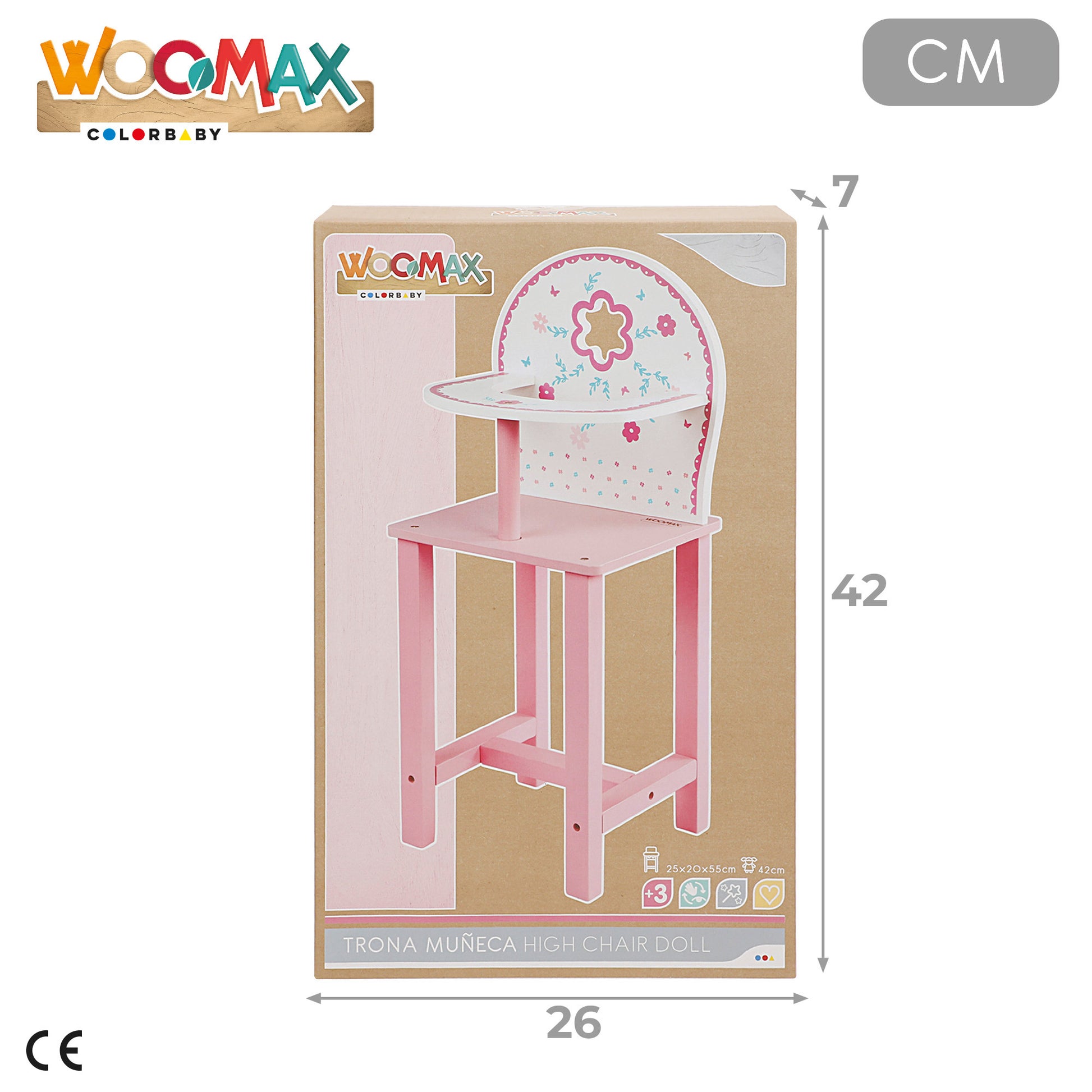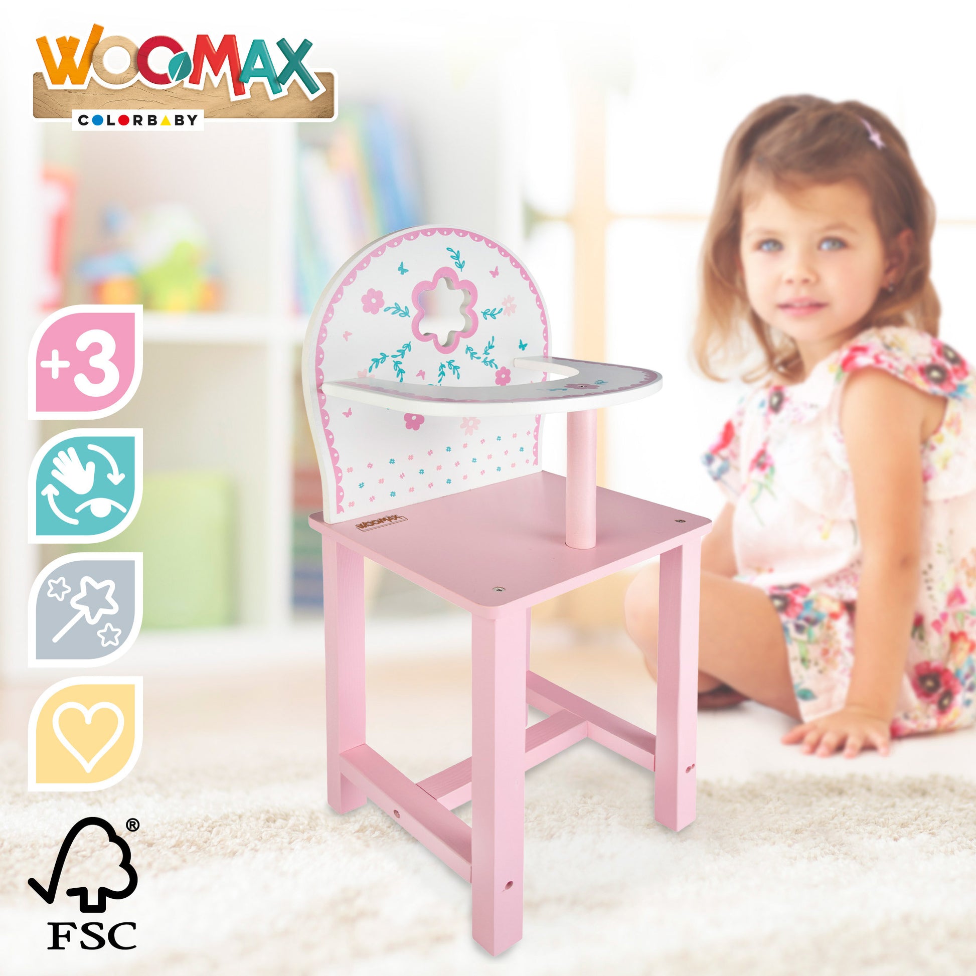 Trona de madera natural WOOMAX para muñecas de 30 a 40 cm. Con un bonito diseño francés en blanco y rosa con florecitas. Tiene todos los bordes redondeados ysuaves para evitar astillas y es 100% reciclable. La trona fomenta la reproducción de toles adultos como el cuidado de bebés, la expresión de emociones y la imaginación. Requiere montaje de un adulto. Recomendado para mayores de 3 años.