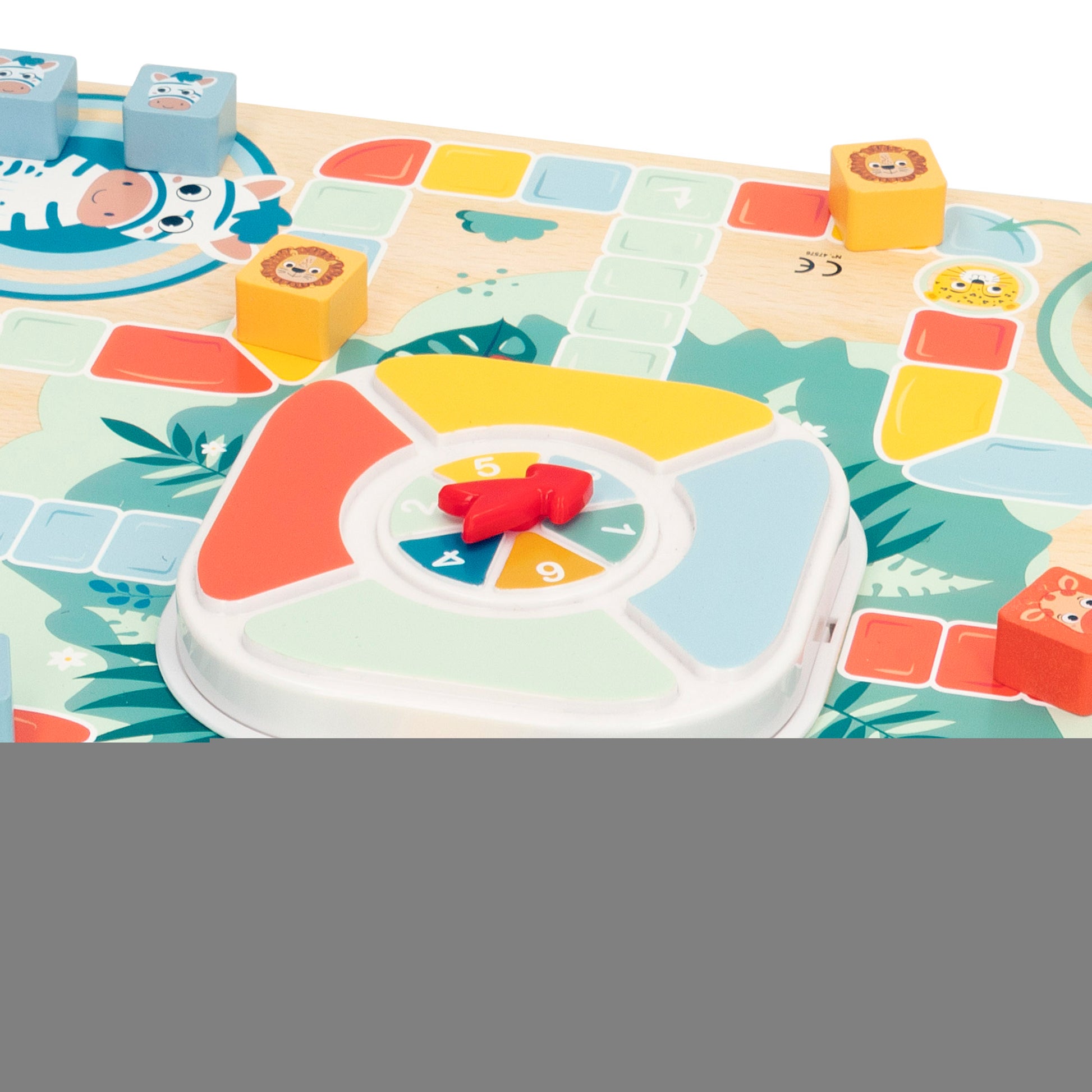 El juego de madera incluye un tablero de madera 2 en 1: por un lado está el juego del parchís y por el otro, el de la oca. Incorpora una ruleta central extraíble para cambiarla de un lado del tablero a otro, colocarla en el centro y que haga la función de dado. El juego de mesa también incluye 16 fichas con personajes de animales de la selva (cebra, león, jirafa y leopardo), con 4 fichas de cada personaje.
