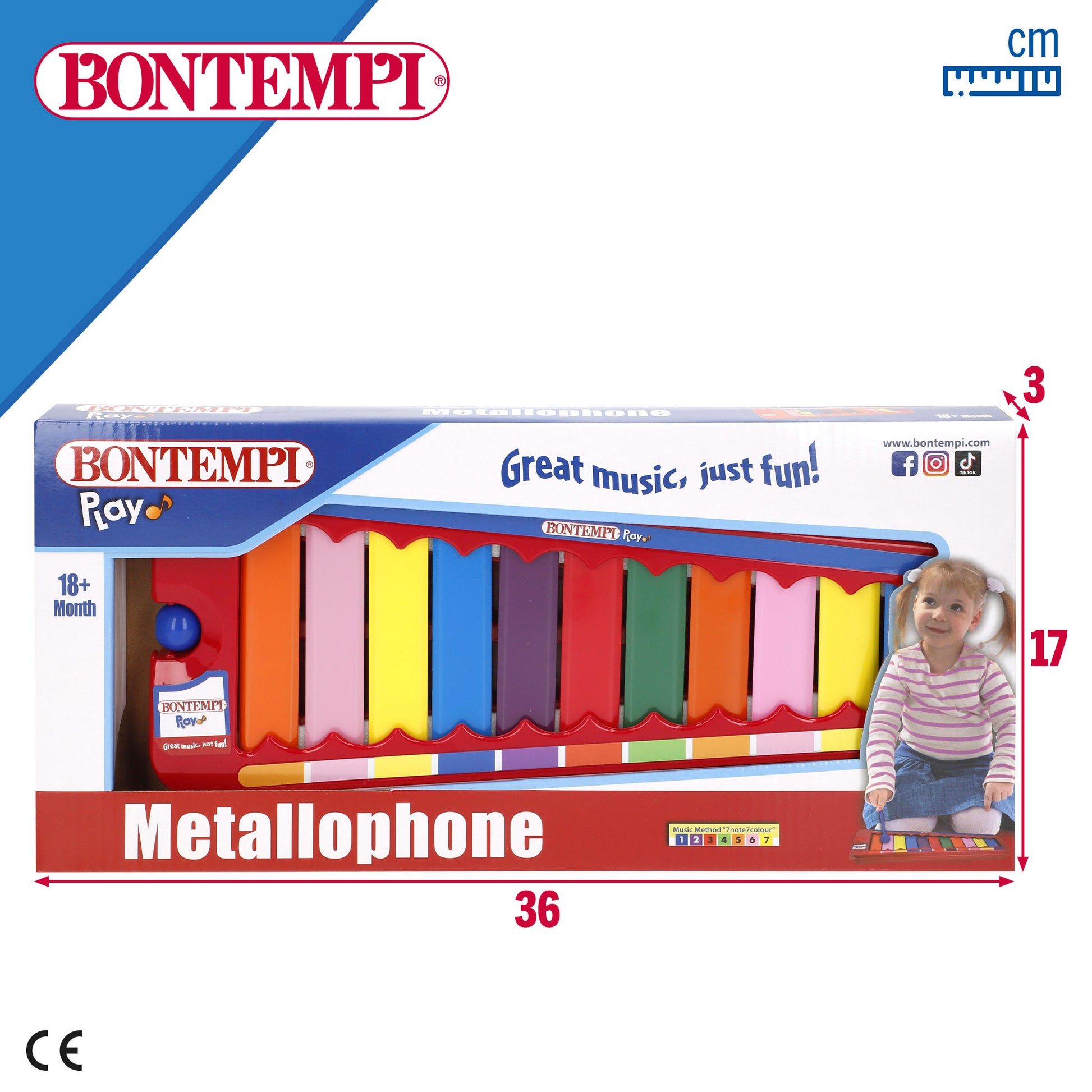 Incluye un xilófono con 8 teclas metálicas de distintos colores, montadas sobre una base resistente en color rojo. También se acompaña de una baqueta ligera y segura, adaptada para manos pequeñas, con la que podrán tocar cómodamente desde el primer uso.